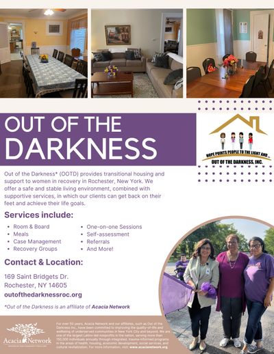 Out of the Darkness (OOTD) provides transitional housing and support to women in recovery in Rochester and its surrounding areas. We offer a safe and stable living environment, combined with supportive services, in which our clients can get back on their feet and achieve their life goals.